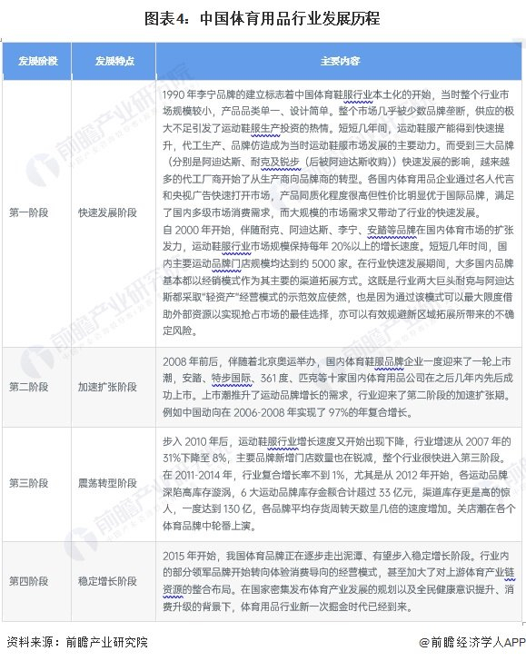 中国体育鞋服企业很多是做国际品牌代工起家,在早期的发展过程中,通过经营品牌和快速发展经销体系,这些公司中的大多数都顺利把握住了体育运动用品行业发展的第一次掘金时代。不过,在经历了快速的外延增长周期后,产品导向的经营模式及粗放式经销批发模式的弊端让整个行业陷入了冰谷,经营持续恶化的例子比比皆是。事实上,过去几年中体育用品行业“去库存”、“关店潮”等案例屡见不鲜也正是基于此的策略调整。总的来说,我国体育用品行业已经进入第四发展阶段。