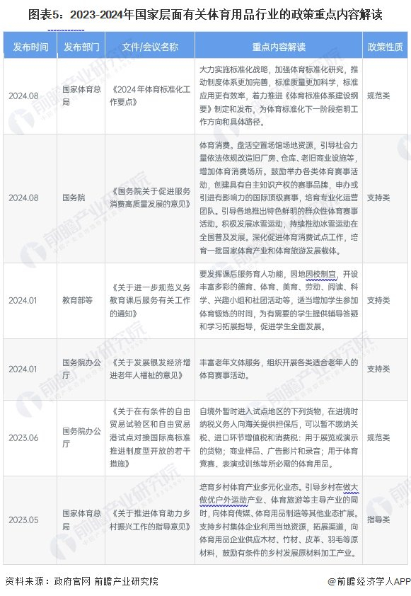 近些年,我国针对促进体育产业发展出台了各种扶持政策,为推进体育产业的高质量发展,各项政策的针对度也越来越细化具体。目前,我国对体育用品行业的发展较为重要的相关政策主要如下: