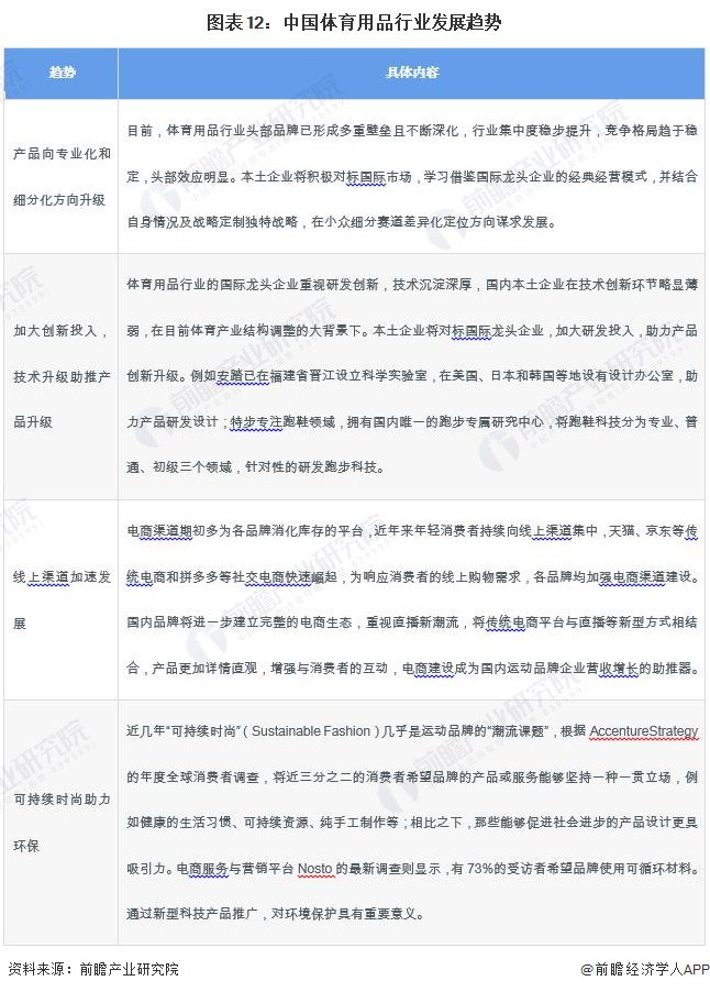 中国体育用品行业将呈现产品向专业化和细分化方向升级、创新投入力度加大、线上渠道加速发展等发展趋势: