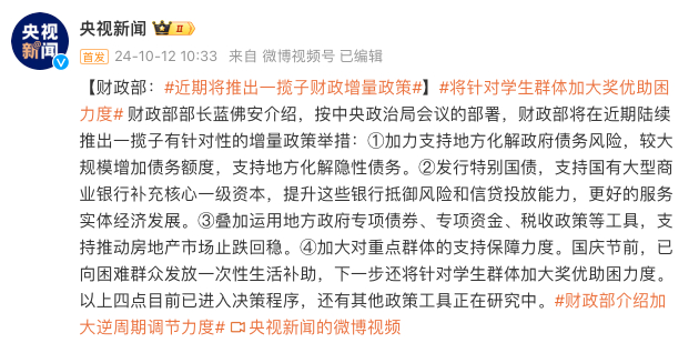 财政部部长蓝佛安介绍,按中央政治局会议的部署,财政部将在近期陆续推出一揽子有针对性的增量政策举措:①加力支持地方化解政府债务风险,较大规模增加债务额度,支持地方化解隐性债务。②发行特别国债,支持国有大型商业银行补充核心一级资本,提升这些银行抵御风险和信贷投放能力,更好的服务实体经济发展。③叠加运用地方政府专项债券、专项资金、税收政策等工具,支持推动房地产市场止跌回稳。④加大对重点群体的支持保障力度。国庆节前,已向困难群众发放一次性生活补助,下一步还将针对学生群体加大奖优助困力度。以上四点目前已进入决策程序,还有其他政策工具正在研究中。