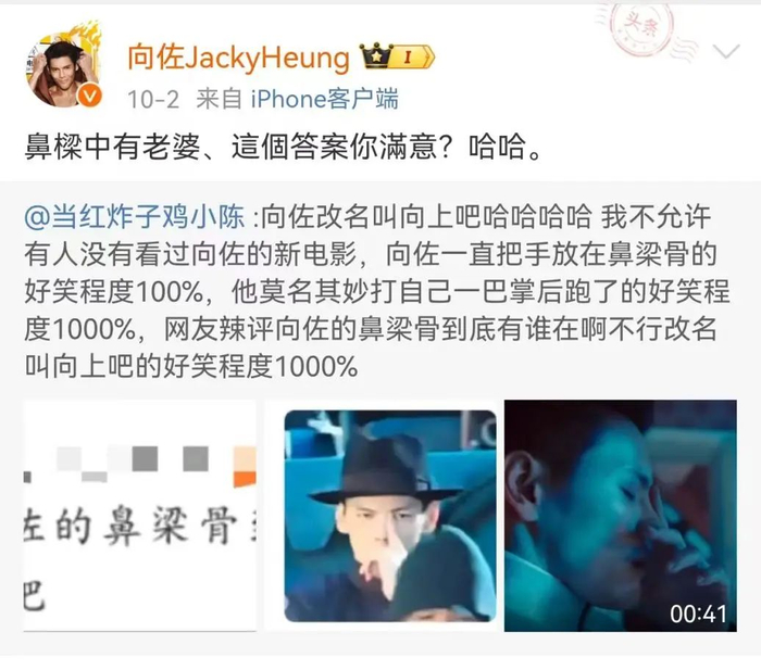 在影片《门前宝地》中,向佐装酷耍帅,思考要摸鼻梁,讲话要摸,就连坐个颠簸的黄包车也要摸,网友神评论:他就不怕戳到眼睛吗?