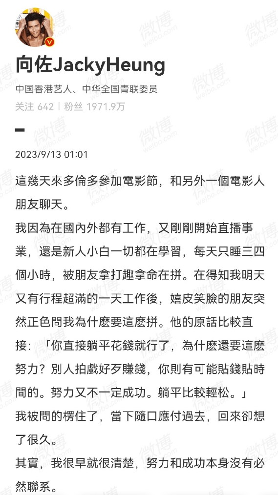 2023年,向佐开始大力搞直播,一天只睡三四小时,朋友说他那么拼命干嘛?直接躺平花钱就好了嘛!别人拼命拍戏好歹为了赚钱,他这贴钱贴时间的,努力又不一定成功,还不如躺平轻松一点。