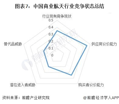 根据以上分析,对各方面的竞争情况进行量化,0.5代表最大,0代表最小,目前我国商业航天行业五力竞争总结如下: