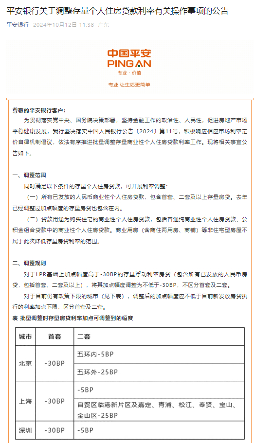 10月12日金融一线消息,平安银行今日关于调整存量个人住房贷款利率有关操作事项的公告。公告称,对于LPR基础上加点幅度高于-30BP的存量浮动利率房贷(包含所有已发放的人民币房贷,包括首套、二套及以上),将其加点幅度调整为不低于-30BP,不区分首套及二套。 对于目前仍有政策下限的城市,调整后的加点幅度应不低于目前新发放房贷执行的利率加点下限,区分首套及二套。LPR基础上加点幅度高于-30BP的存量浮动利率房贷(包含所有已发放的人民币房贷,包括首套、二套及以上),平安银行将于2024年10月25日集中批量调整合同贷款利率,批量调整后于当天起按新的利率水平执行,此前利息均按原合同利率水平计算。