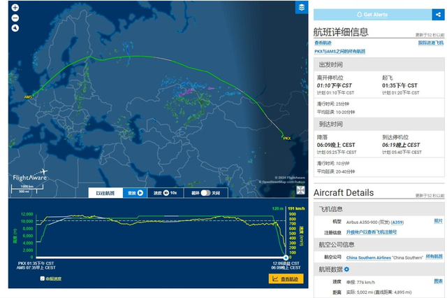 注意这两张图对比:都是飞北京至阿姆斯特丹航线。南航CZ345飞越俄罗斯,走大圆航线,距离为5000英里。荷兰皇家航空KL898绕飞,看上去更直但实际距离更远,近6000英里。
