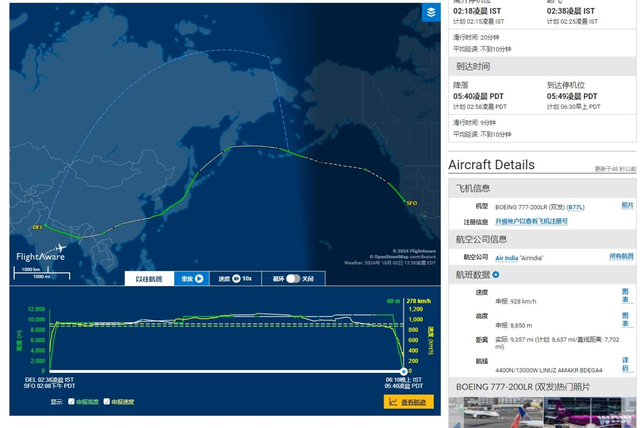 美西方航司在指责中国航司抄近路以外,印度等国和中东国家的航司也无辜躺枪。印度航空公司在飞往美国的航班上,通常选择飞越俄罗斯领空。例如,德里到旧金山(AI173)、德里到纽约,以及德里到芝加哥的航班也有可能飞越俄罗斯。这一选择为印度航空在运营效率和成本上提供了显著优势,与不绕飞的美方航司相比,通常可以节省数小时的飞行时间及相应的燃油消耗。