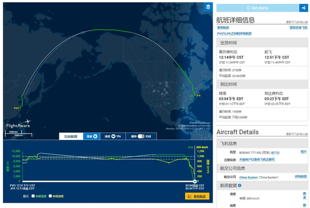 东航MU587航班,从上海飞纽约,注意飞越俄罗斯的“大圆航线”。