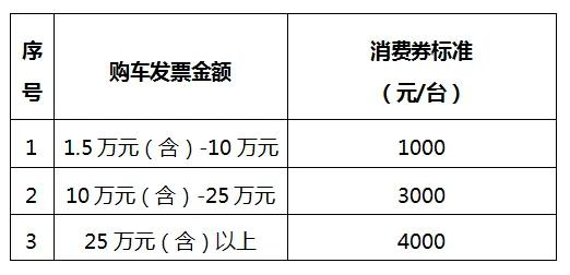 消费券以“云闪付APP”红包的形式发放,按购车发票金额分为两档,具体标准如下: