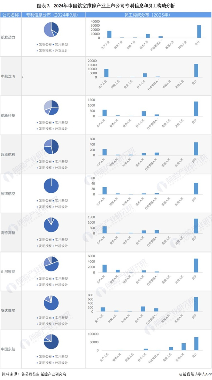 从航空维修行业的上市企业已有的公开信息分析,专利信息相对较多的企业是航发动力,其中发明专利1143条;员工总数最多的则是中国东航,员工总数为81781人,其中技术员工10559人;生产人员相对最多的同样是航发动力,总数为17512人。