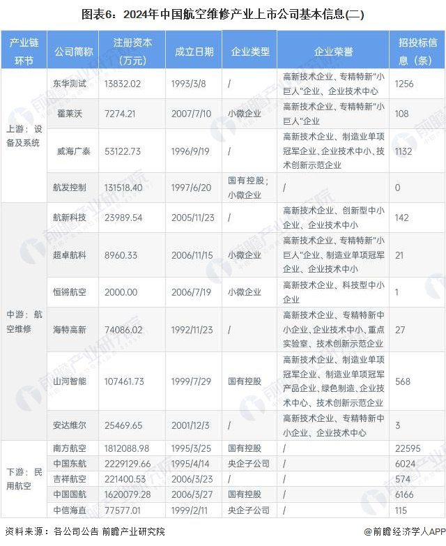 从航空维修产业的上市企业布局和已有公开信息分析,注册资本最多的是中国东航,而成立时间最早的是光威复材,招投标信息最多的则是南方航空。
