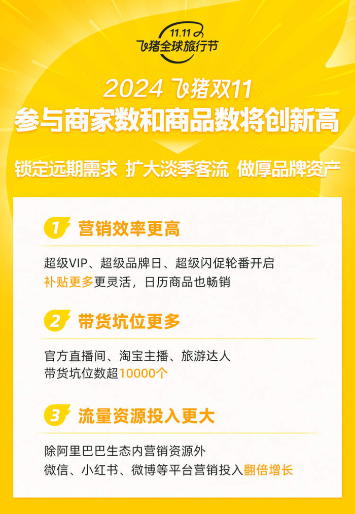 据帅梦婷介绍,除了阿里巴巴生态内更大力度的流量获取措施外,双11期间飞猪在微信、小红书、微博等平台的流量及营销投入同比翻倍增长。同时,飞猪整合了官方直播间、淘宝主播和专业旅游达人资源,今年提供的带货坑位数达上万个,创下历届双11之最。此外,飞猪将加大日历型商品的补贴力度。