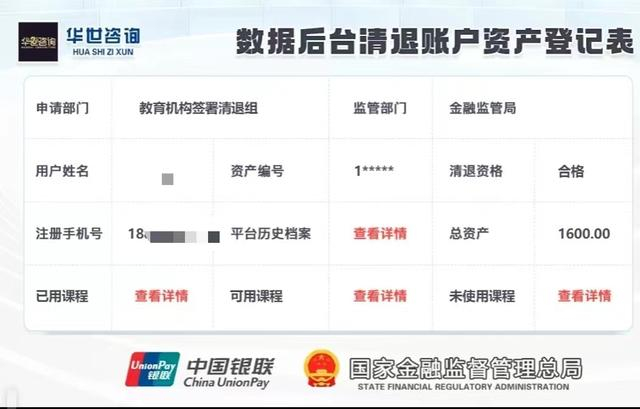 贺鹏称,7月10日,对方发来的“数据后台清退账户资产登记表”显示,他有一笔1600元的退费,该表格上不仅有“华世咨询”的图标,还有“中国银联”和“国家金融监督管理总局”的图标,这又再次打消了他的疑虑。