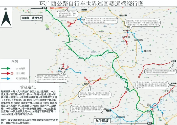 封闭石景林路(九牛爬坡广场至友谊大道路段)→友谊大道→丽江路→崇左一桥→太平路→进城大道→环城北路→G359国道→新和镇环城南路→新和镇滨江大道→卜花村(卜花民宿)→G359国道→G359国道雷平镇与新和镇交界处→G243国道雷平镇三叉路口→X536县道恩城路口→恩城科甲二级路路口→G359国道科甲二级路路口→明仕景区→大宁一级公路谨汤路口→G219国道岩应路口→硕龙镇硕龙街→G219国道下雷镇锰矿路口→G219国道大新与靖西交界点。