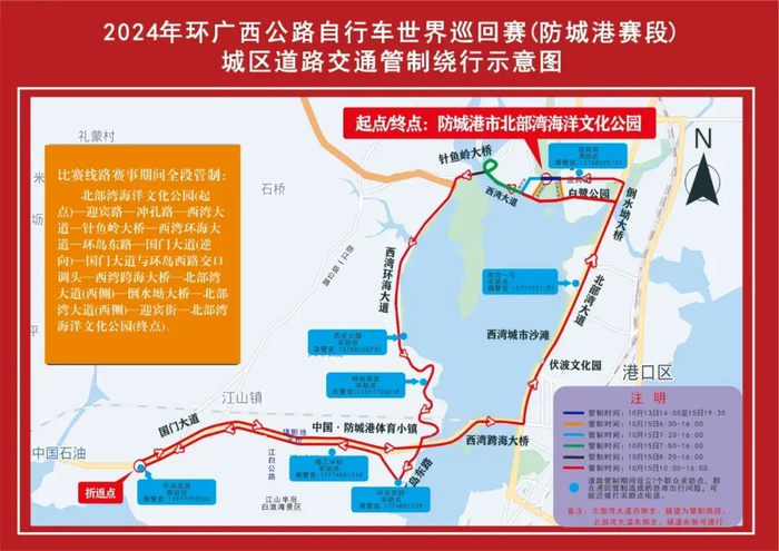 防城港赛段比赛将于10月15日举行。赛事期间交警部门将对比赛路线及其周边道路分路段、分时段采取临时交通管制措施。