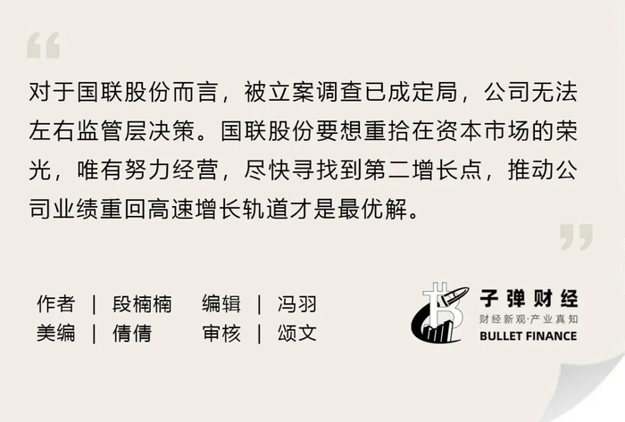 对于国联股份而言,被立案调查已成定局,公司无法左右监管层决策。国联股份要想重拾在资本市场的荣光,唯有努力经营,尽快寻找到第二增长点,推动公司业绩重回高速增长轨道才是最优解。