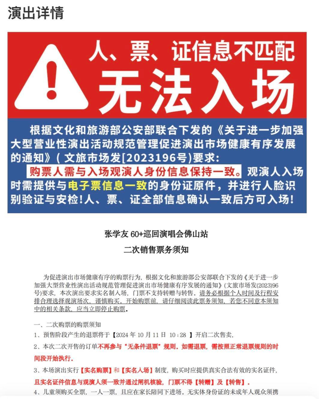 “张学友60+巡回演唱会”佛山站最新的销售票务须知也用红色字体标注了强实名注意事项,称“人、票、证信息不匹配无法入场”,实行实名购票和实名入场制度,实名证件信息与观演人须一致并通过闸机核验,门票不得转赠和转售。因观演人在购票中所填信息有误或其他信息不正确,导致无法入场或退票,须自行承担责任。