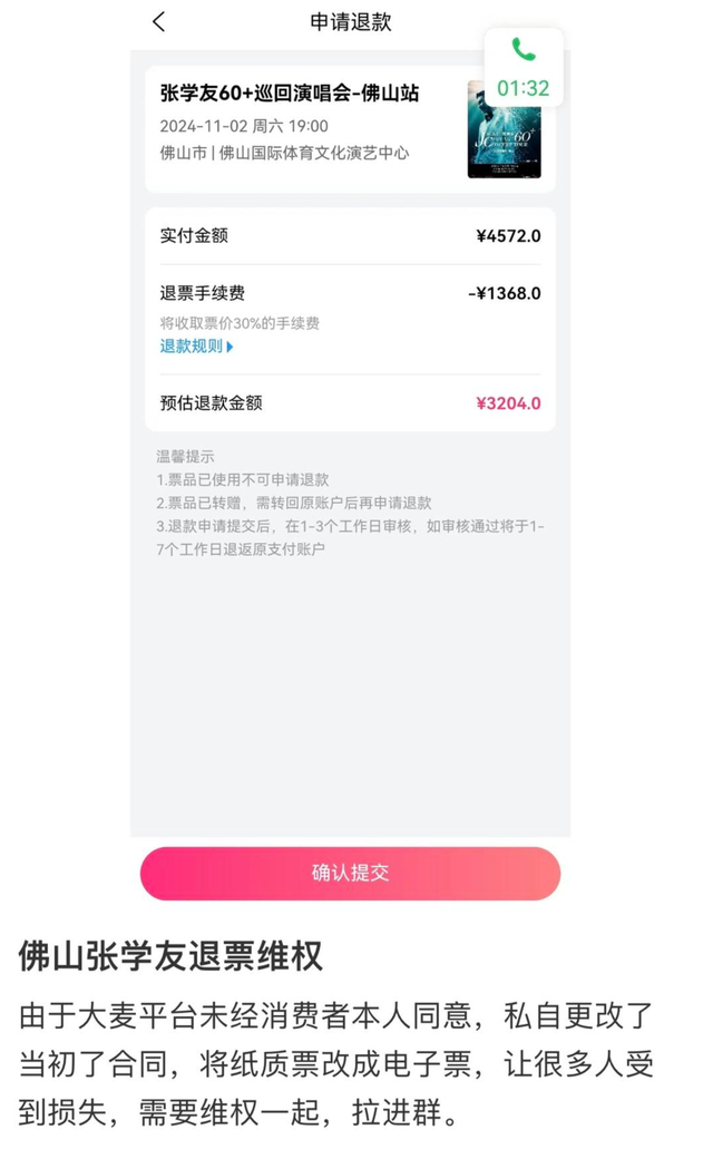 佛山的赵女士也回忆,她想和先生一起去看,一开始抢到的是两张座位分开的票,后来有票放出后,她用朋友的信息买了两张连座的票,退掉了之前的票。也有自称看了张学友多场次演唱会的粉丝称,佛山站是目前国内为数不多的可以通过纸质票入场的张学友演唱会,当时也是冲着这一点,想收集纸质票才选择购买。目前临时换成电子票让他们权益受损,现在退票需扣30%的手续费,也即最高票价的内场2280元的门票需扣684元。