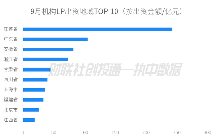 从地区来看,9月备案基金的机构LP中,安徽出资95次最活跃,江苏出资84次位居第二;与上月相比,安徽出资活跃度提升明显,天津进入出资活跃榜前十。从披露的认缴资本来看,江苏出资约243亿元,跃居第一,约占全国出资总额的29%;广东紧随其后,出资额达105亿元。