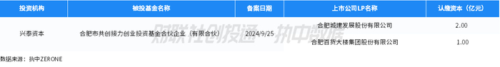 其中,合肥城建(002208.SZ)投资了1支备案基金合肥市共创接力创业投资基金合伙企业(有限合伙),认缴资本2亿元,为9月出资金额最高的上市公司LP。