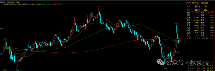 甲醇2501合约当前的支撑主要是在2300,压力位主要在2700,受到供需的影响大幅度下跌,又受到宏观的影响大幅度反弹,当前方向不明显,既然有朋友希望我写一下,那就写一下。
