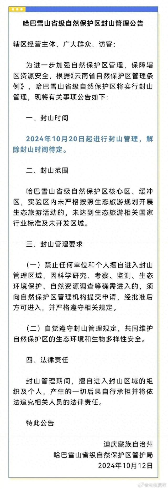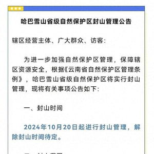 10月12日,云南迪庆藏族自治州哈巴雪山省级自然保护区管护局发布的《哈巴雪山省级自然保护区封山管理公告》称,将于10月20日起进行封山管理,解除封山时间待定。