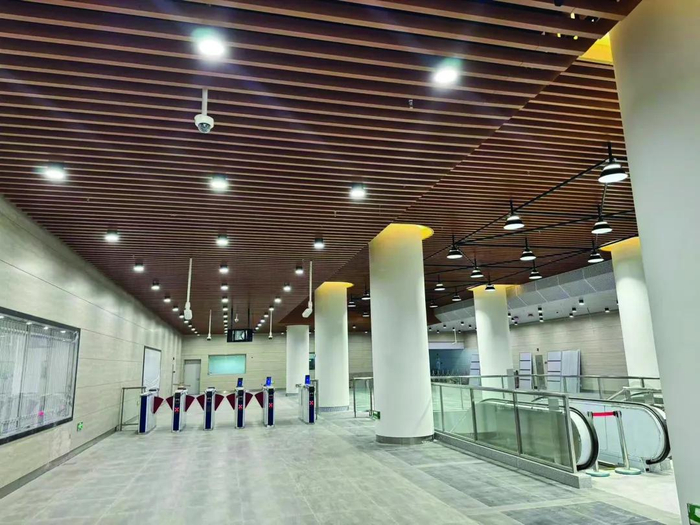 地铁11号线文化中心站位于河西区友谊路与平江道交口东北侧,沿友谊路南北走向敷设,为地下二层岛式站台换乘车站。记者通过已经完工的A1出入口走进车站看到,目前站内的装饰装修工程已经基本完工,包括闸机、自动售票机等设施也已到位。站厅层的顶部采用有层次感的不对称铝制木纹装饰,给人一种通透的空间感。站内地面的瓷砖颜色采用了深灰、中灰和浅灰三种拼花,整体灰色调稳重、含蓄、雅致。地铁11号线与既有地铁5、6号线换乘通道建成后将大大提高枢纽站的换乘和通行作用,并进一步提升周边商业体活力。