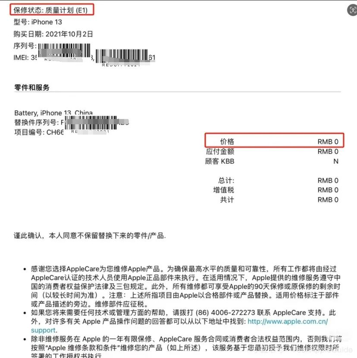 成都一位成功免费给iPhone 13更换电池的张先生称自己的手机购买于2021年10月,最近电池出现一点点鼓包,电池容量下滑严重,只有62%,看到苹果可以免费换电池的帖子后,就去了线下直营店咨询。苹果直营店工作人员在他的手机上经过了一番操作,最后显示维修费用就是0元,也就是免费维修。不过张先生也不清楚具体需要符合什么样的条件才能免费维修。