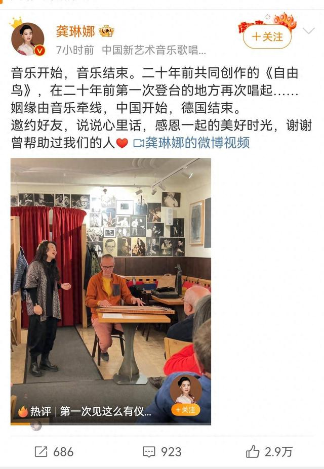 两人20年婚姻结束,并没有撕破脸,也没有闹腾的鸡飞狗跳,反而比较平和。龚琳娜微博写道:“音乐开始,音乐结束。二十年前共同创作的《自由鸟》,在二十年前第一次登台的地方再次唱起……姻缘由音乐牵线,中国开始,德国结束。邀约好友,说说心里话,感恩一起的美好时光,谢谢曾帮助过我们的人。”
