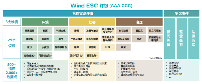 Wind ESG评级由管理实践与争议事件两大部分组成:管理实践指标体系区分环境、社会、治理三大维度,细分29个议题,并下设500多个具体指标;争议事件基于新闻舆情、法律诉讼、监管处罚进行评估,以综合反映企业的ESG管理实践水平以及重大突发风险。