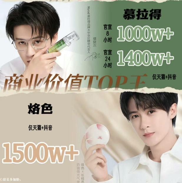 这种现象在流量艺人中确实比较常见,檀健次就是例证之一。去年8月29至9月28短短一个月内就官宣了包括幕拉德、帕拉丁、烙色、奥伦那素、祖玛珑、肯德基在内的六个代言,其中烙色、奥伦那素、幕拉德三个都是美妆护肤类产品。