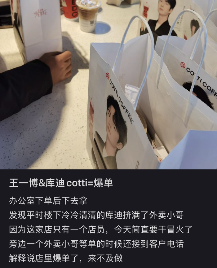 流量筑起的护城河促进了品牌声量的释放。官宣后各大城市多个库迪门店接单量爆棚,明星引流效应出圈,多个库迪门店出现爆单,有不少网友表示,“因为王一博开始尝试库迪咖啡”,库迪以王一博为灵感推出“生椰啵啵系列”,全国门店爆单,甚至被粉丝喊话“承包”。