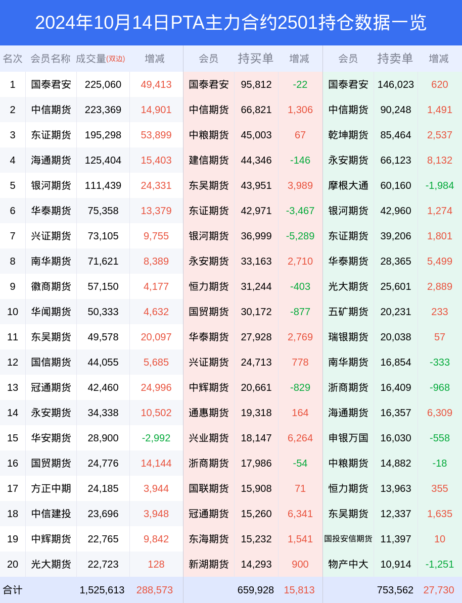 新浪期货 根据交易所数据,截至10月14日收盘主力合约PTA2501,涨跌-1.10%,成交量103.30万手,持仓数据显示前20席位呈现净空,差额头寸为93634手。