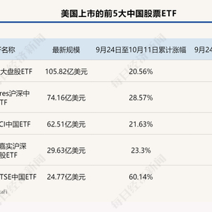 截至10月11日,美国上市的规模最大的5只中国股票ETF除中国大盘股ETF-iShares之外,还有KraneShares沪深中国互联网ETF、安硕MSCI中国ETF、Xtrackers嘉实沪深300中国A股ETF和三倍做多FTSE中国ETF。这五大ETF的最新规模分别为105.82亿美元、74.16亿美元、62.51亿美元、29.63亿美元和24.77亿美元。
