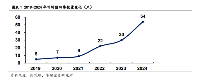 通过历年数据对比,我们可以看到可转债回售数量和金额的增长并非线性。2019年到2023年期间,虽然增长趋势明显,但增速相对平稳。然与往年相比,2024年的回售数量和金额增长尤为显著,分别达到了54只和317331.93万元,与2023年的30只和2053.04万元相比,2024年的数量和金额分别增长了80.0%和156倍。这种增长可能与近年市场环境的变化有关,包括经济波动、政策调整及市场对转债信用风险的重新评估,同时也反映出市场活跃度的提升。