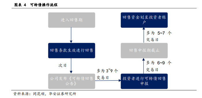 在发行的可转债的最后两个计息年度,可转债进入回售期。当公司股票在任何连续30个交易日的收盘价格低于当期转股价格的70%时,回售条款生效,可转债持有人有权进行可转债回售。次日,公司发布《可转债回售公告》,与中国结算联系有关可转债回售的保证金和后续事宜。在3~9个交易日后,暂停转股,投资者进行可转债回售的申报,多持续6~9个交易日。在回售申报期截止后,公司披露《可转债回售结果公告》,回售资金会划至投资者账户,如上市公司不能将相应的款项及时划至中国结算账户,可转债回售资金的到账时间将顺延,届时上市公司应及时发布风险提示公告。