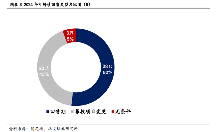 2024年可转债回售主要受股价下跌和募投项目变更影响。股价下跌触发回售条款的情况占51.85%,募投项目变更占42.59%,无条件回售仅占5.56%,显示出市场对风险的敏感性和对公司透明度的期待。
