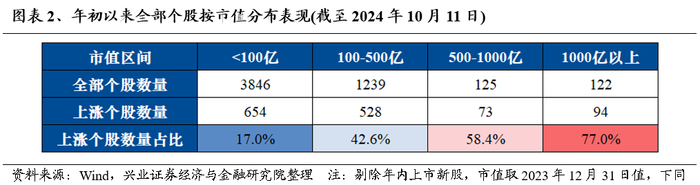 年初以来我们一直强调,市场已进入高胜率投资时代。大盘、龙头作为符合时代特征的贝塔,也因此成为今年市场的重要超额收益来源。截至10月11日,以中证A50、沪深300为代表的大盘指数显著跑赢,而中小微盘指数则大幅跑输。行业层面,我们统计了申万31个一级行业年初以来的涨跌幅中位数,也发现绝大多数行业都是龙头跑赢。更进一步地,我们按市值区间分组统计了年初以来的市场表现,发现市值是决定胜率、影响收益的关键因子。提升市值门槛成为提高胜率的一个简单有效的方式。