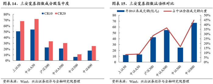 与此同时,从流动性来看,中证A500交投活跃,从2024年指数成分的合计成交金额来看,覆盖了中证全指约37%的成交额。从指数成分股的集中度来看,中证A500覆盖了各行业最具代表性的一批公司,成分股集中度CR10、CR20分别为21.0%和30.5%,个股集中度水平和沪深300类似,低于中证A50和上证50。较低的集中度降低了中证A500对个股特质风险的暴露,提升了指数的可投资性。
