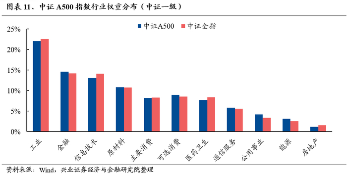 和已经发布的中证A50相比,中证A500囊括更多股票,对A股覆盖度更高,代表性更强;另一方面,和沪深300、中证500等主流宽基指数相比,中证A500强调保持指数成分行业市值分布与样本空间尽可能一致,从而又具备了较好的行业表征性。