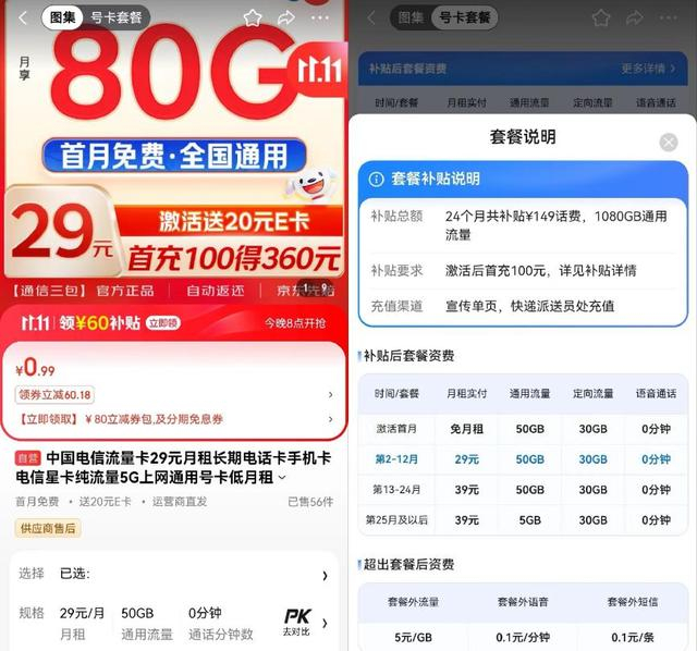 中国电信铂金卡就很适合有大流量需求的消费者办理。激活后首充100元得360元,即首月赠送40元话费,自动抵扣首月月租;首充100元中国电信补贴120元,激活时在快递员处参加首充活动,100元本金立即到账,次月起用户正常在网返10元话费,连续12个月,相当于次月起月租为29元;还有京东11.11特别充送活动,首充100元京东送100元话费,次月起用户正常在网返10元话费,连续10个月。激活首充后综合80GB流量,包含50GB通用流量+30GB定向流量,激活还送20元京东E卡。