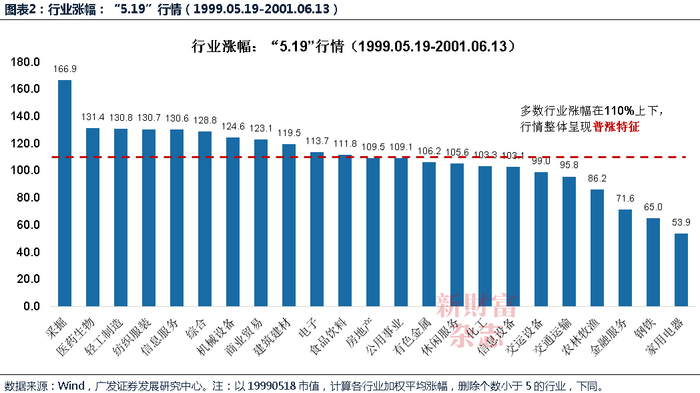 事实上,除了个别行业之外,多数行业的涨幅均在110%上下,“5.19”行情整体呈现的是普涨的特征。