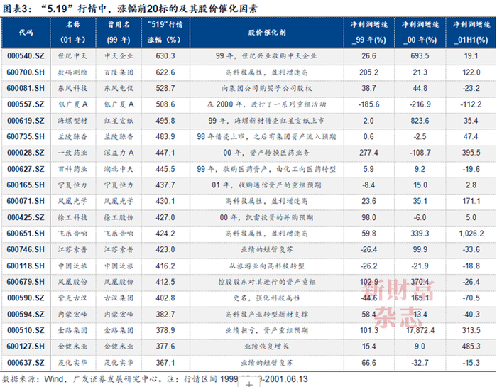 同时,在“5.19”行情中,涨幅前20的龙头标的,多数都有阶段性的强劲业绩增速,以及并购重组事件的催化。