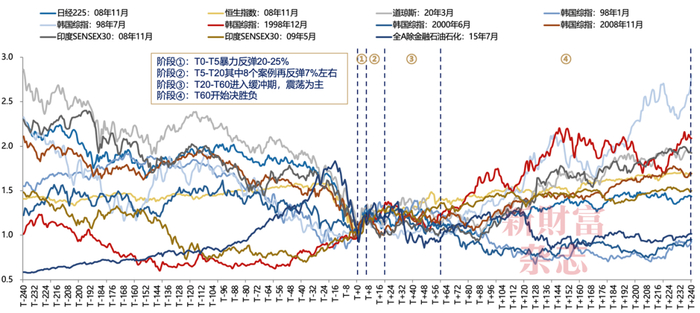 但是,5个交易日指数反弹超过25%,也是十分罕见的。历史上,其他股票市场,单周上涨20%后发生了什么?历史不会简单重复,但总有借鉴意义。全球市场来看,出现5日涨跌幅超20%的情况并不多见。我们复盘了中国内地、美国、日本、中国香港、中国台湾、法国、英国、德国、韩国、印度等权益市场宽基指数5日上涨超20%的情况,共有11轮行情。核心结论可以总结为四个阶段。在第一阶段,上涨的第0-5天,趋势是暴力反弹20-25%;第二阶段,第5-20天,其中8个案例再反弹7%左右;第三阶段,大涨后第20-60天,进入缓冲期,震荡为主;第四阶段:第60天开始决胜负,是走牛市,还是重新下跌。