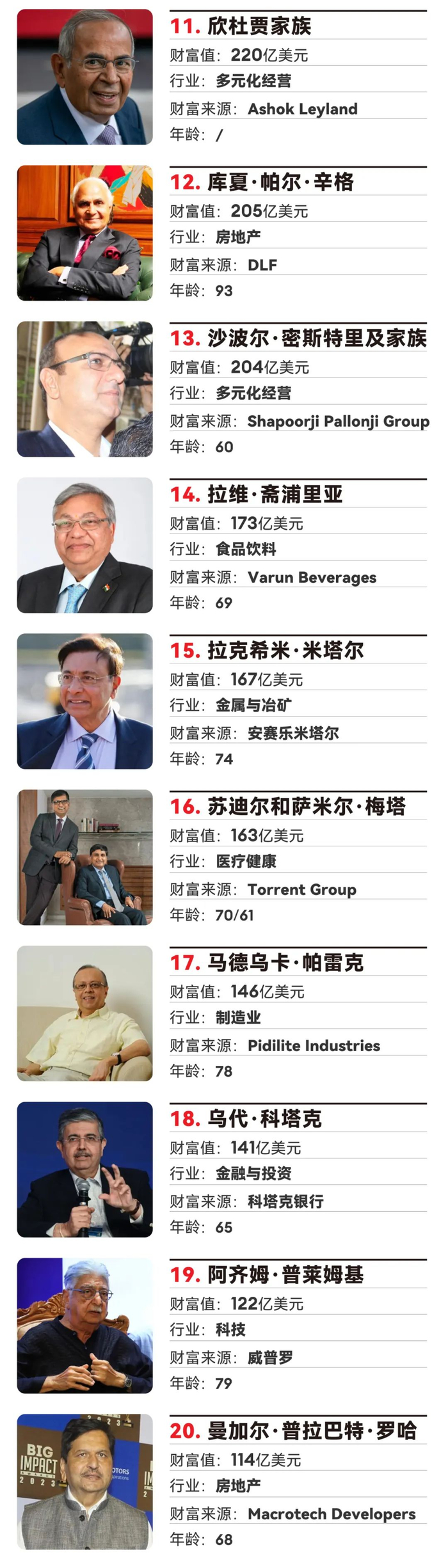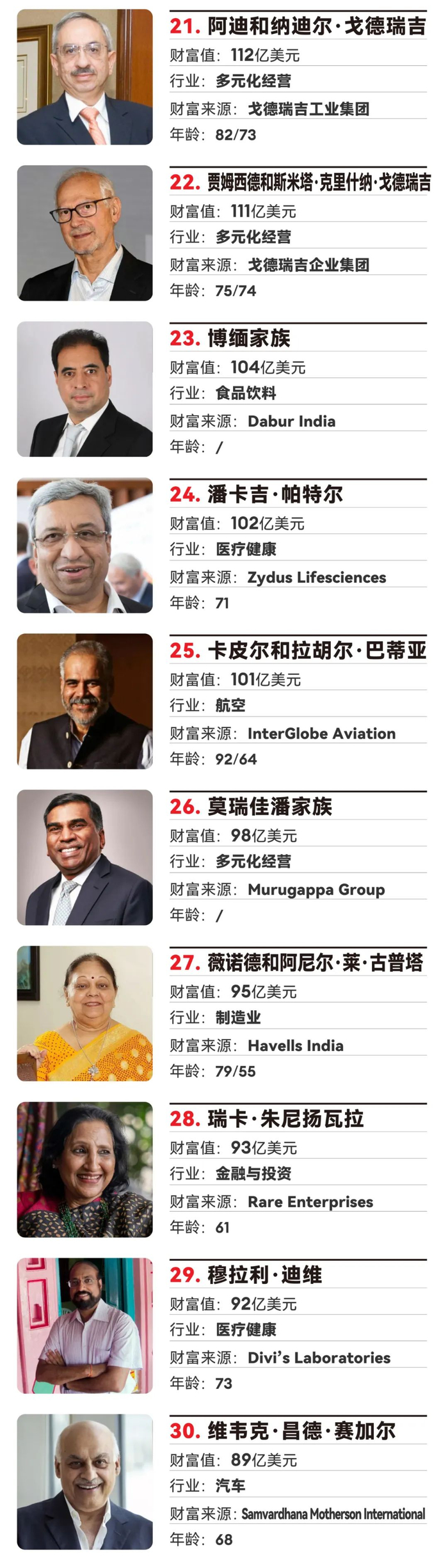 知名的戈德瑞吉(Godrej)家族在4月重新划分了资产,将其控股的公司分归两派来管理,家族成员也因此首次在榜单中分开出现:阿迪(Adi)和纳迪尔·戈德瑞吉(Nadir Godrej)兄弟控制戈德瑞吉工业集团(Godrej Industries Group)下属的上市公司,他们的堂兄妹贾姆西德(Jamshyd)和斯米塔·克里什纳·戈德瑞吉(Smita Crishna Godrej)则控制戈德瑞吉企业集团(Godrej Enterprises Group)未上市的旗舰公司Godrej & Boyce。