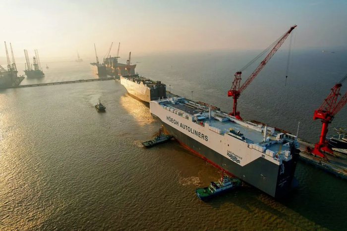 2024年8月8日,招商局集团旗下招商工业海门基地建造的第一艘9100车双燃料汽车滚装船“礼诺极光”号顺利驶离船厂码头,该船是目前全球最大环保型汽车滚装船