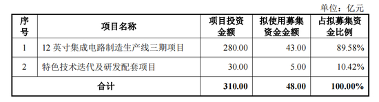 本次IPO,新芯股份计划募集资金48亿元,其中48亿募资中有43亿用于投入12 英寸集成电路制造生产线三期项目、5亿募资用于特色技术迭代及研发配套项目。
