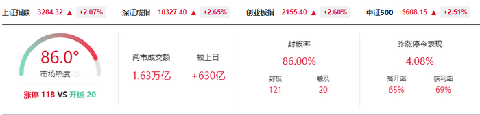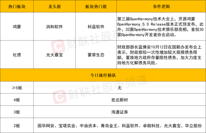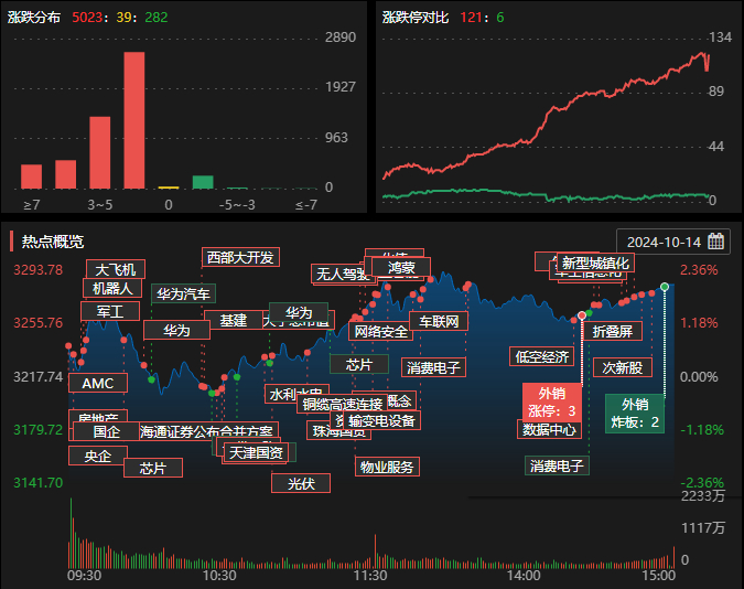 市场全天探底回升,三大指数均涨超2%。截至收盘,上证指数涨2.07%,深证成指涨2.65%,创业板指涨2.60%,北证50指数涨6.61%。全市个股涨多跌少,超5000家飘红。全天成交1.63万亿,较昨日放量630亿。内资主力净流出8.711亿。盘面上,题材概念股全线飘红。鸿蒙、华为昇腾、华为鲲鹏等华为产业链集体爆发,软通动力、艾融软件、罗博特科、常山北明等40余股涨停;军工板块全天强势,晟楠科技、北方长龙、中航电测等纷纷封板;化债概念股全线走高,蒙草生态、信达地产等多股涨停;跨境支付、数字货币概念持续拉升,任子行、科蓝软件等涨停;消费电子概念股表现活跃,经纬辉开涨停,星星科技、精研科技涨超10%;除此之外,西部大开发、国企改革/并购重组、铜缆高速连接、房地产等板块纷纷走强。消息面上,1、财政部10月12日在国新办发布会上出台一系列利好政策!①财政部部长蓝佛安表示将在近期陆续推出一揽子有针对性的增量政策举措;②财政部拟一次性增加较大规模债务限额,置换地方政府存量隐性债务,加大力度支持地方化解债务风险;③财政部表态三大举措支持房地产;2、10月14日,东部战区开展“联合利剑-2024B”演习,舰机多向抵近台岛;3、第三届OpenHarmony技术大会上,开源鸿蒙OpenHarmony 5.0 Release版本正式预发布;4、据彭博社报道,俄罗斯正积极推动金砖国家间的跨境支付体系改革,挑战美国金融主导地位。