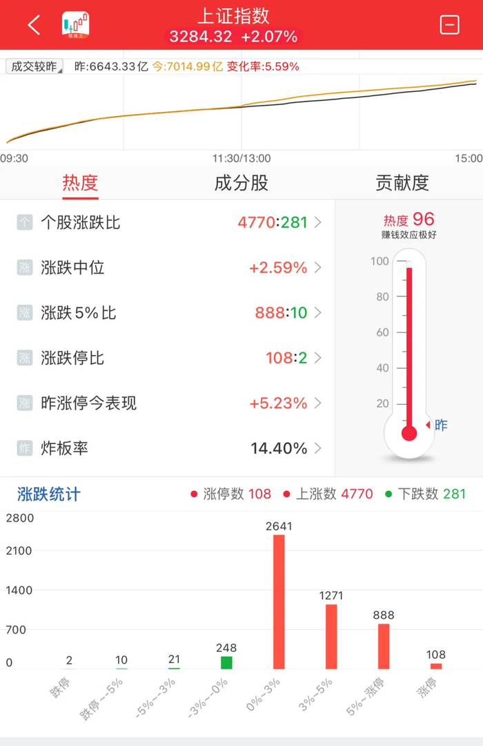 评:今天全线发反攻了,沪指涨2%,深成指、创业板涨近3%。个股5000家上涨,仅282家下跌,中位数-+2.71%!赚钱效应非常的不错。