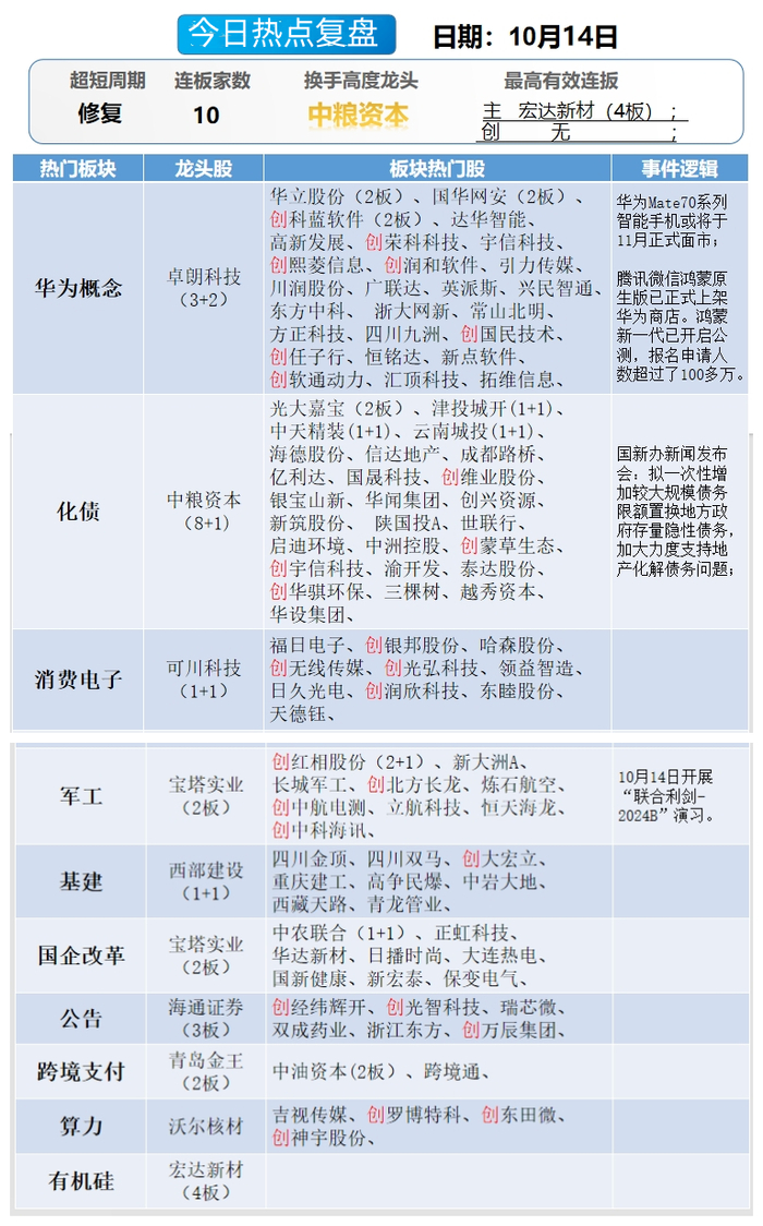 消息面上,1、财政部10月12日在国新办发布会上出台一系列利好政策!①财政部部长蓝佛安表示将在近期陆续推出一揽子有针对性的增量政策举措;②财政部拟一次性增加较大规模债务限额,置换地方政府存量隐性债务,加大力度支持地方化解债务风险;③财政部表态三大举措支持房地产;2、10月14日,东部战区开展“联合利剑-2024B”演习,舰机多向抵近台岛;3、第三届OpenHarmony技术大会上,开源鸿蒙OpenHarmony 5.0 Release版本正式预发布;4、据彭博社报道,俄罗斯正积极推动金砖国家间的跨境支付体系改革,挑战美国金融主导地位。