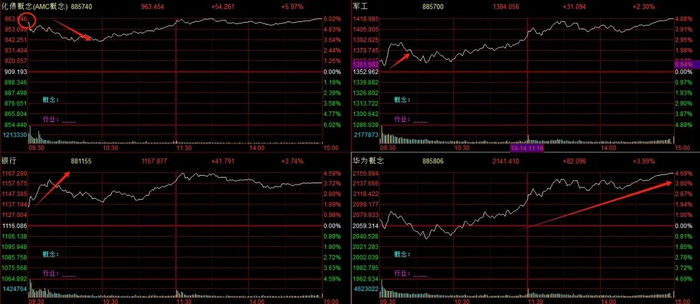 盘前周末发酵最多的是化债题材,但开盘也如预期内的走法一样高开低走,摘桃子的题材成了今天一大早出消息的军工,在军工快速反弹的过程中还叠加了银行,所以早上市场先有一个快速冲高后才走出了回落。